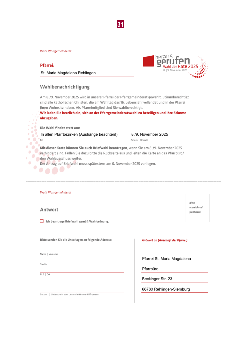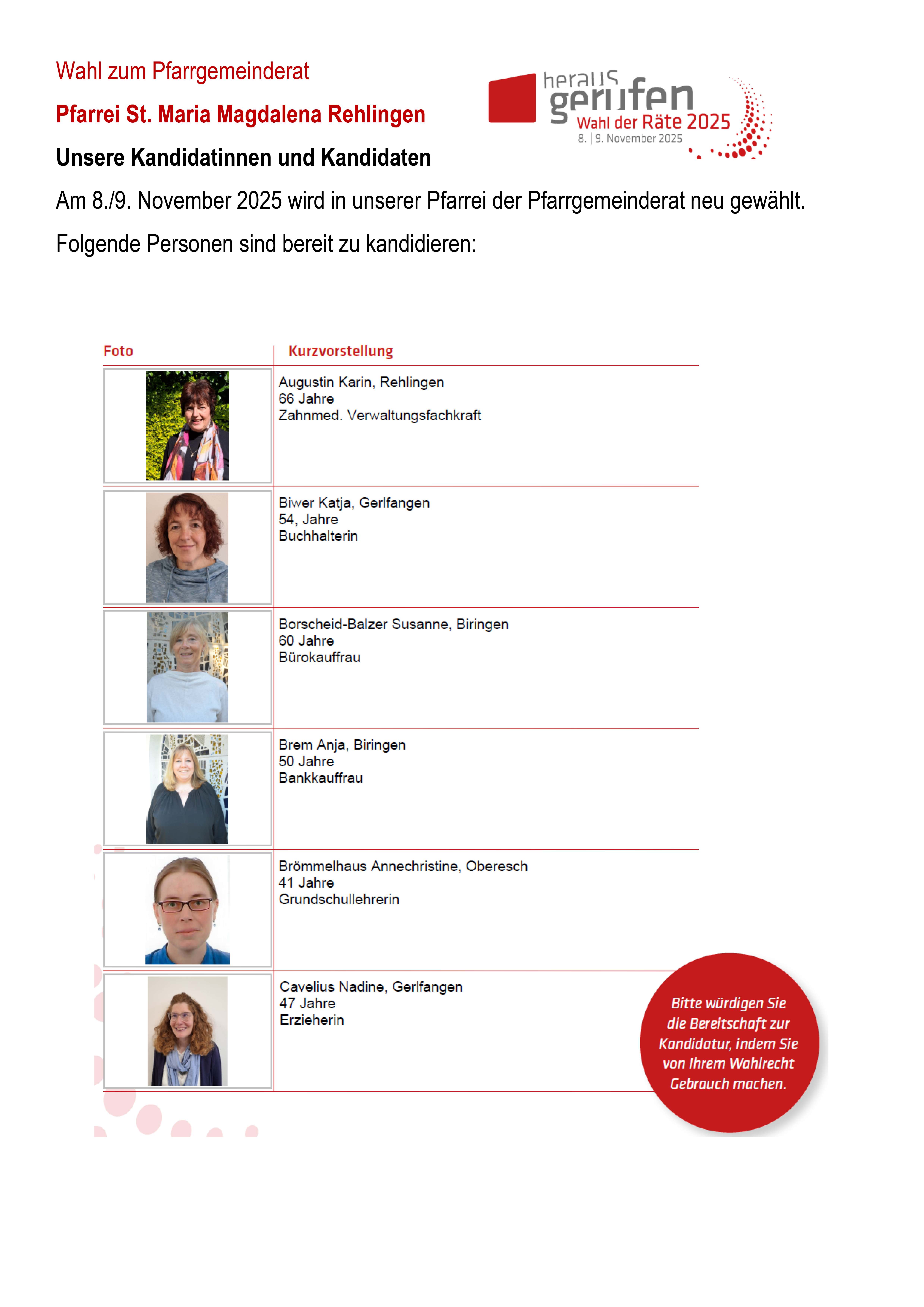 Hinweis zur Pfarrgemeinderatswahl in der Pfarrei St. Maria Magdalena